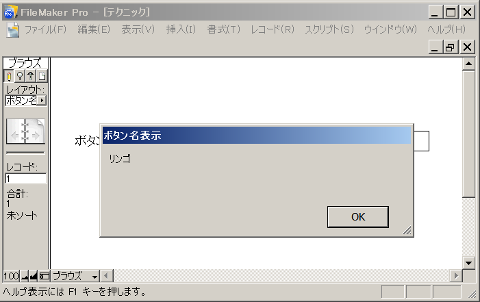 ボタンのスクリプトは、例としてカスタムダイアログでボタン名を表示するようにしました。